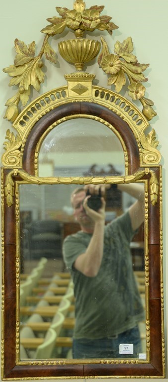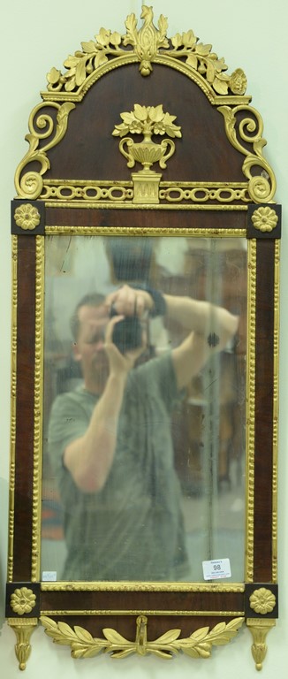 Mirror, mahogany two part with gilt urn crest above demilune mirror panel. height 40 1/2 inches, width 17 1/2 inches Provenance: Estate of R. Donald Bassette