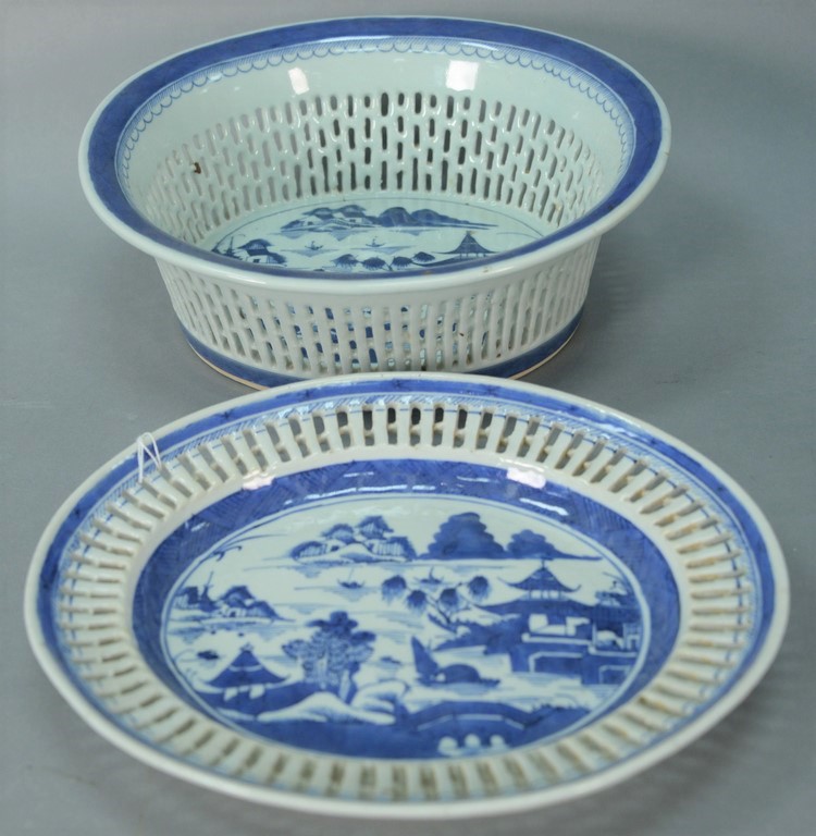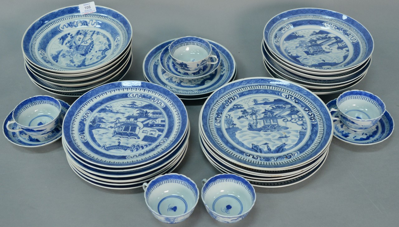 Thirty-six piece Chinese export porcelain Nanking and Canton, near matching blue and white group to include a set of twelve large bowls, seven dinner plates, seven luncheon plates, two bread plates, three saucers, and five tea cups.