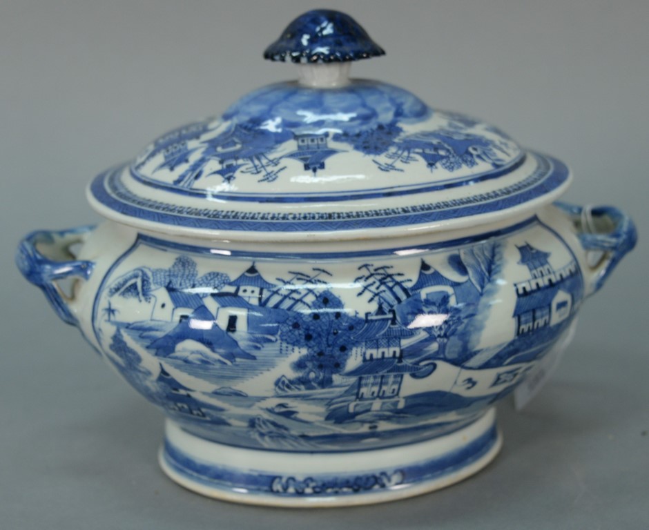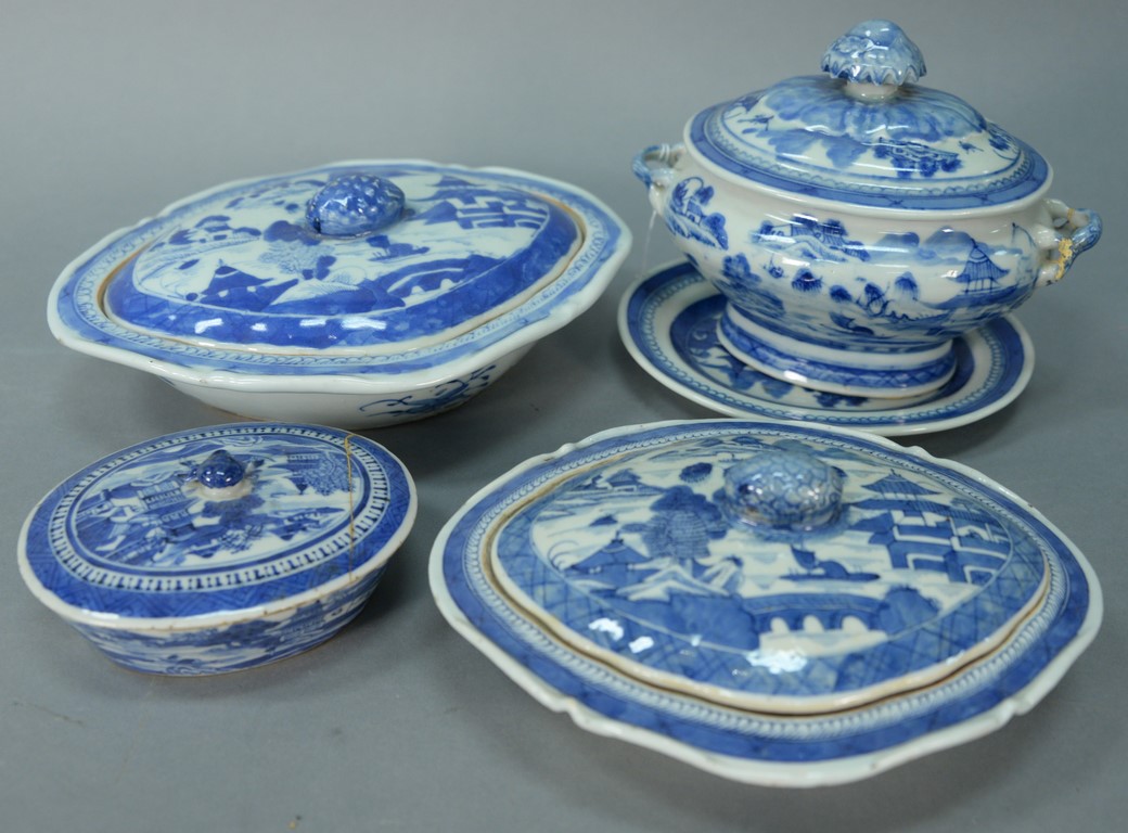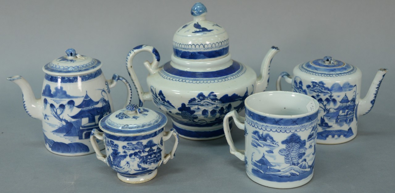 Five piece group of Chinese export porcelain blue and white Canton teapot with scenic views chipped spout, lighthouse form covered coffee pot, drum form covered teapot, covered sugar with two handles, and handled mug.