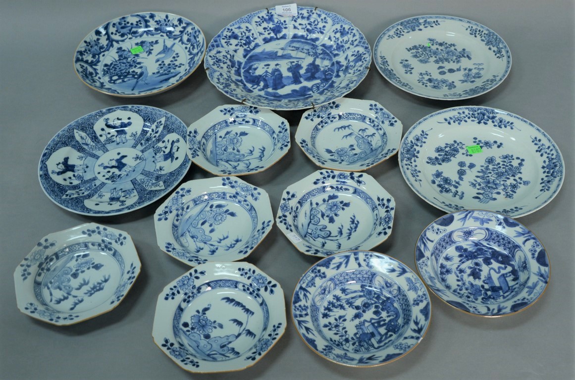Thirteen piece lot of Chinese blue and white porcelain to include a deep plate, Chinese plate with five boys small chip on foot, two small bowls, large deep dish with Guanyin and scholar figures, pair of floral decorated dishes, and a set of six octagon bowls.