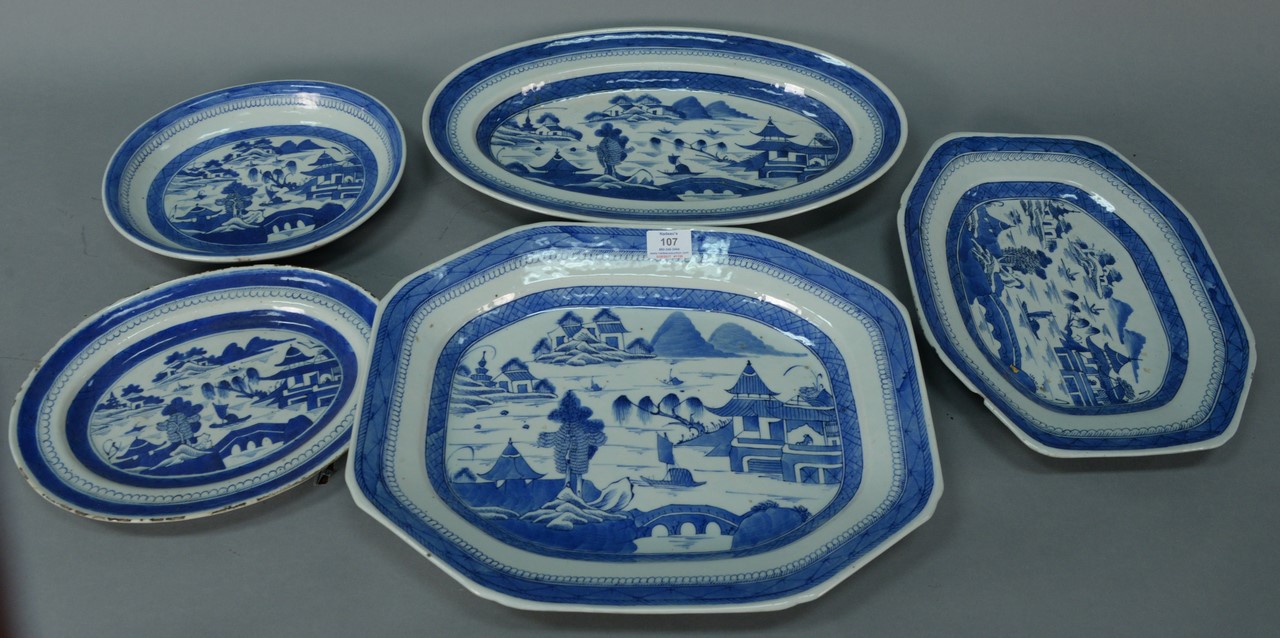 Five blue and white Canton trays including fish tray, two small oval trays, two rectangular trays chipped and cracked, and large tray.
