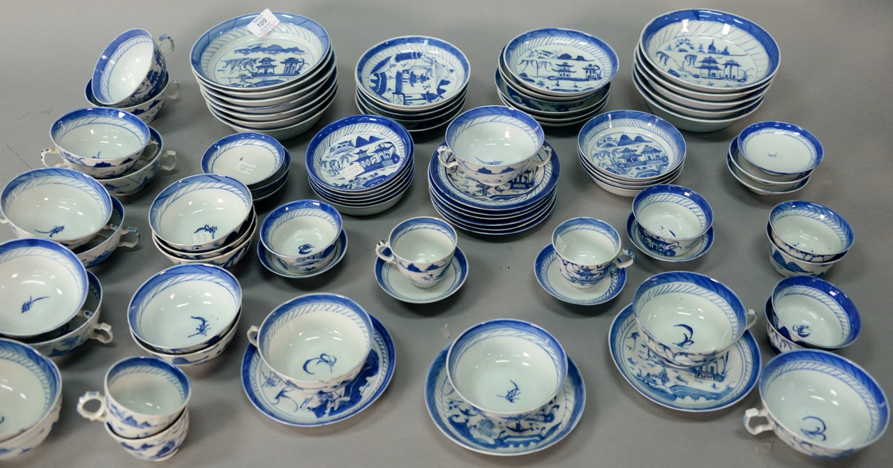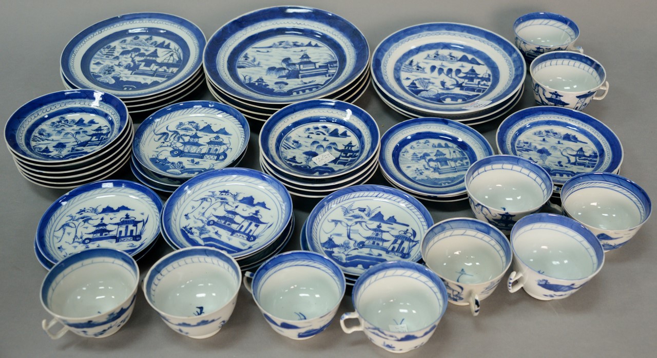Fifty piece group of Chinese export porcelain Nanking and Canton near matching blue and white group to include a set of four dinner plates, seven luncheon plates, ten small bowls, seven bread plates, and a set of twelve cups with ten saucers.