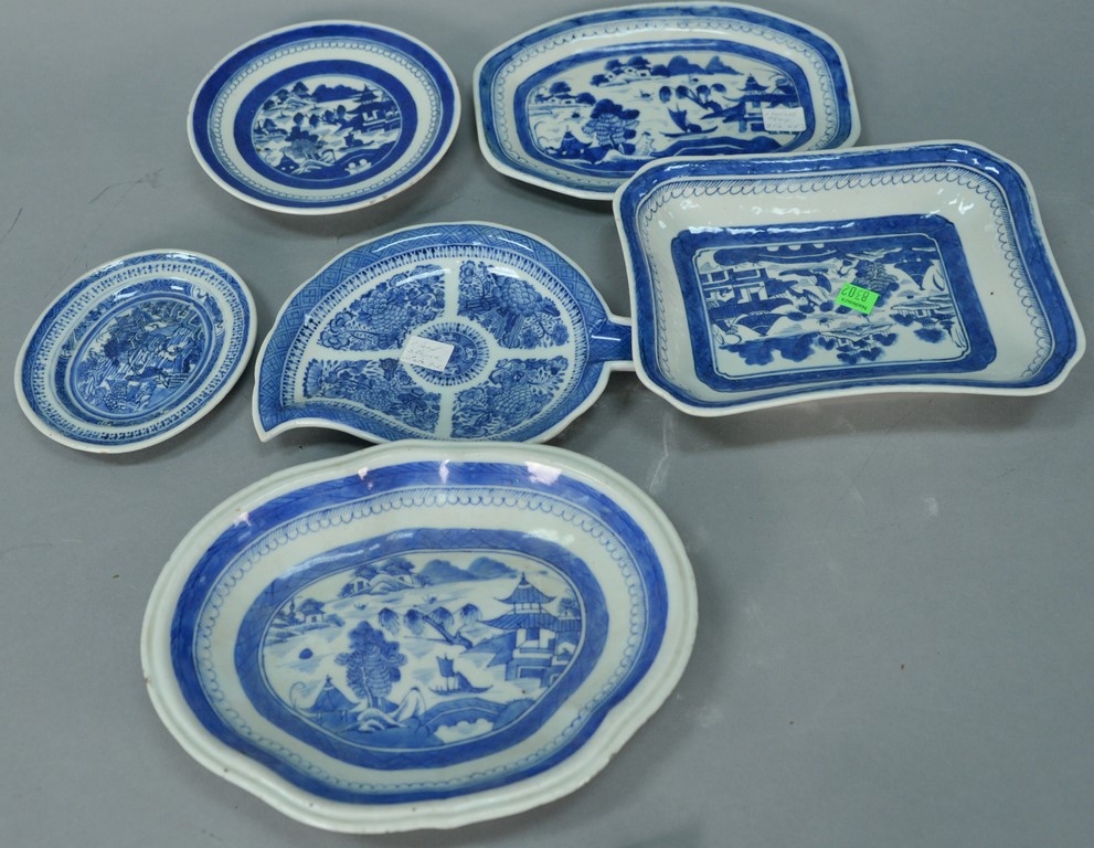 Six piece group of Chinese export porcelain blue and white Canton to include rectangular serving dish, oval tray, small oblong tray, leaf form dish, round footed dish, and small oval dish.