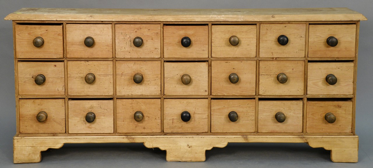 Twenty-one drawer spice cabinet having rectangular top all set on bracket base, 19th century.