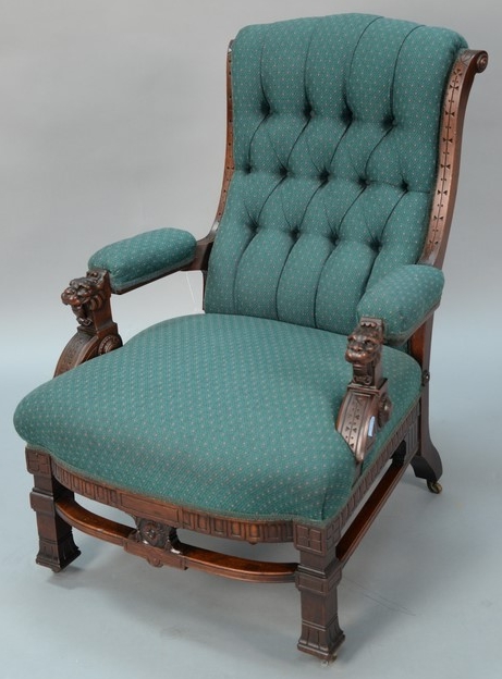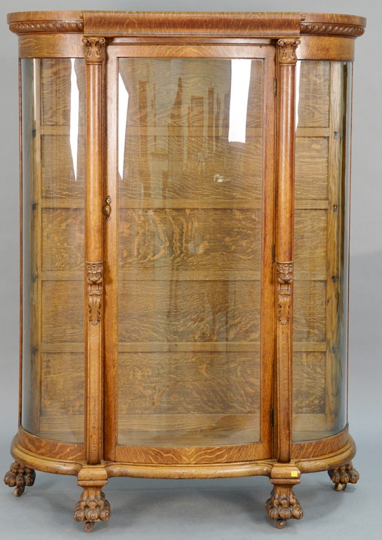 Oak Victorian china cabinet with bowed glass sides and front with carved lion faces and large paw feet.