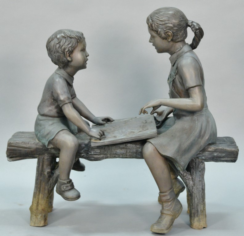 Bronze of young boy and girl on a bench reading a book, signed J.W. Peterson 1998. height 35 inches, width 36 inches Provenance: Collection of Ruth and Jerome Siegel