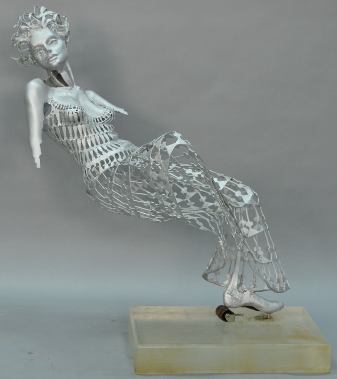 Steel sculpture of reclining woman with openwork dress set on Lexan base, attributed to Roz Newman. height 48 inches, length 50 inches Provenance: Collection of Ruth and Jerome Siegel