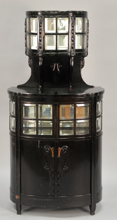 In the manner of Josef Olbrich ebonized wood and glass cabinet, center and top compartment with mirrored back, circa 1910. three bottom panels with cracks ht. 63 3/4in., wd.29 3/4in., dp. 15 1/2in.