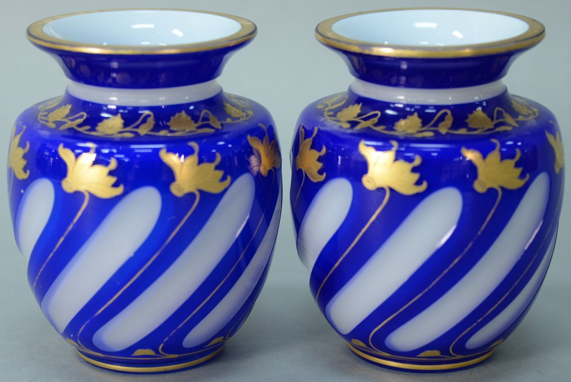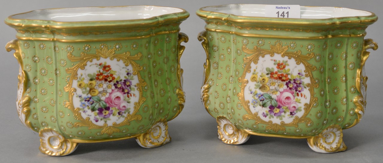 Pair of Sevres porcelain planters having green ground, gilt decorated scroll sides, and high relief gold jeweled design set on gilt decorated scroll feet.