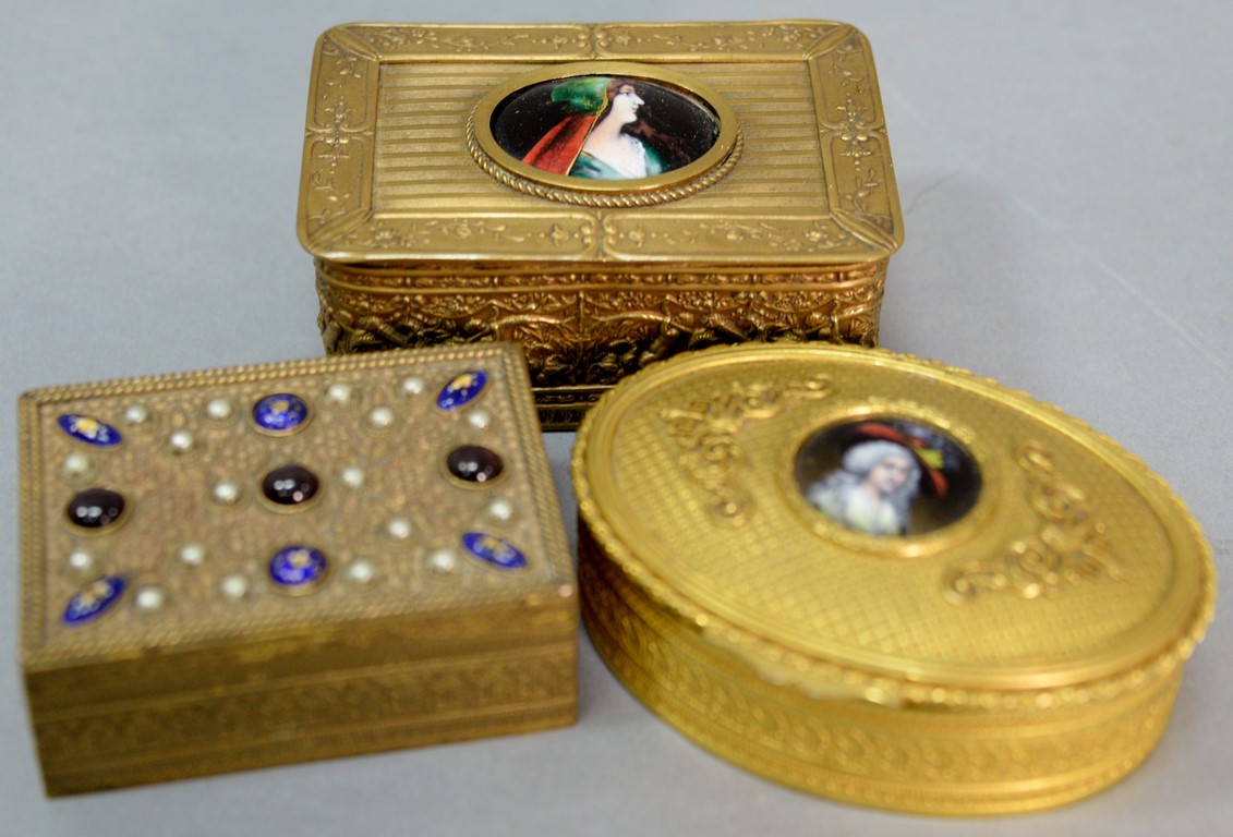 Three French enameled boxes including an oval gilt box with an enameled copper portrait, a rectangular box with an oval enameled copper portrait, and a rectangular box with enameled jeweled top.