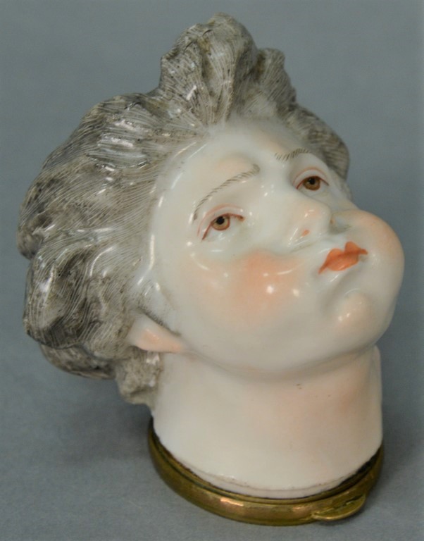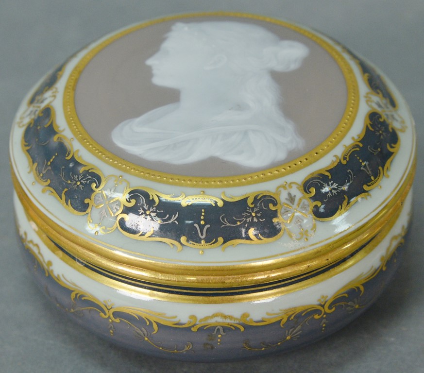 Meissen pate-sur-pate covered circular porcelain box with gilt decoration and finely painted in white slip with a bust of a woman on the cover, marked on bottom with cross swords, late 19th century.