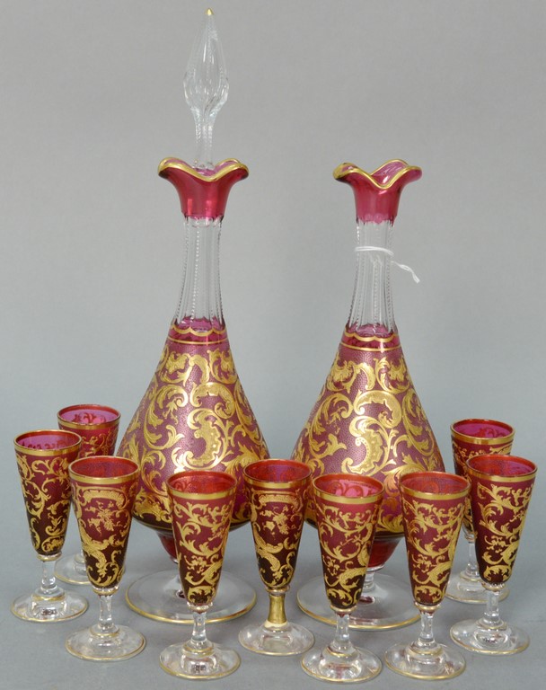 Cranberry cut to clear glass eleven piece decanter set having etched cranberry body with gilt leaf decoration including two carafes and nine cordials, possibly Moser. one stopper as is bottle: height 8 3/4 inches