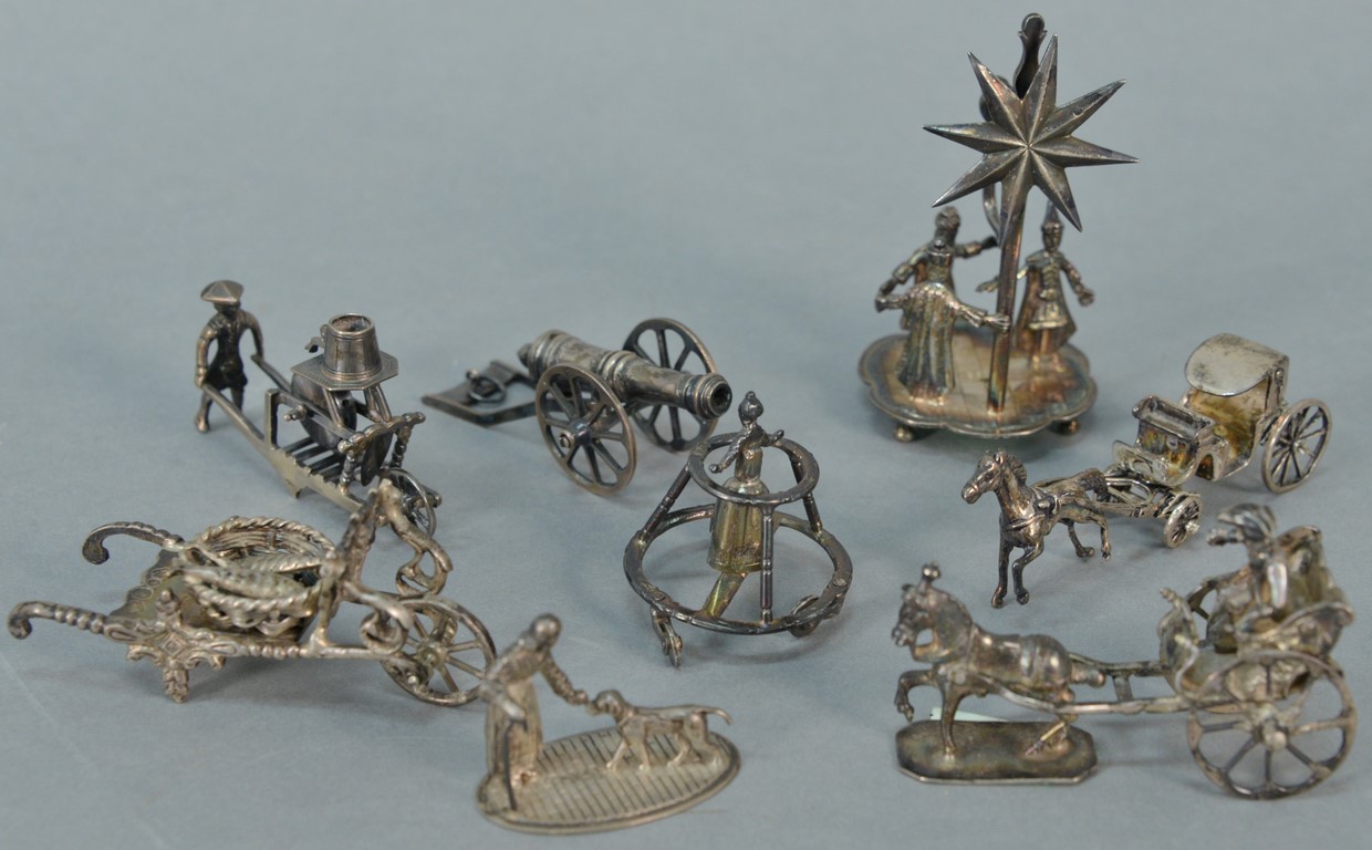Eight piece miniature silver items to include two horse and carriages, canon, wheelbarrow with fish, mechanical windmill with people, woman with a dog, man pushing a wheelbarrow with a mechanical grinder, and small toy.