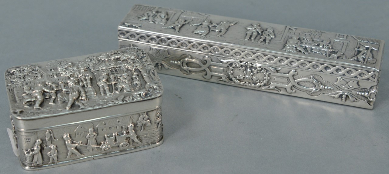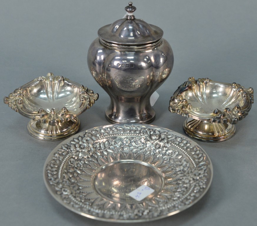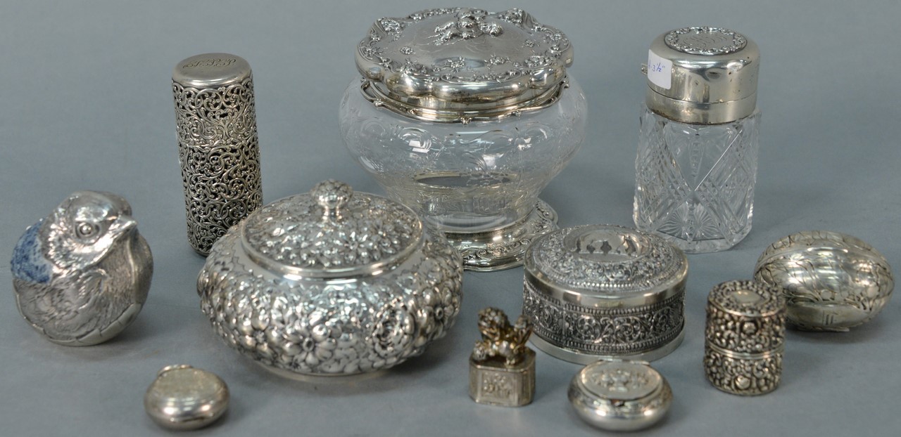 Group of silver to include six small boxes, reticulated container, repousse box, two jars with silver tops, and a figural bird pin cushion. heights 1 1/4 inches to 3 1/2 inches 8.6 weighable troy ounces.