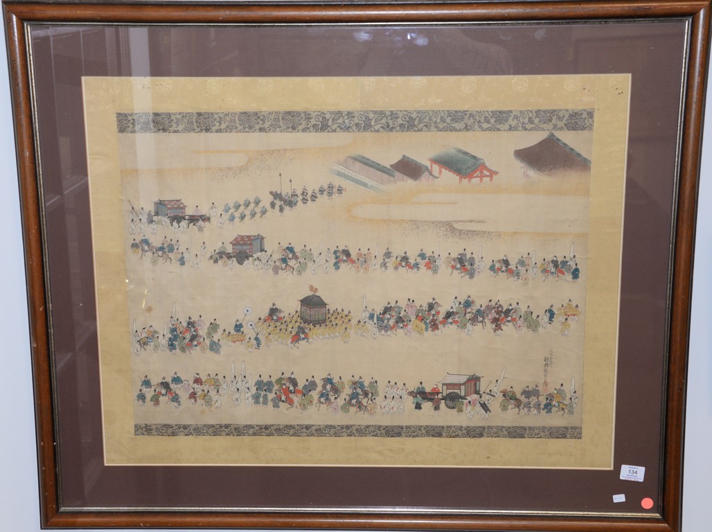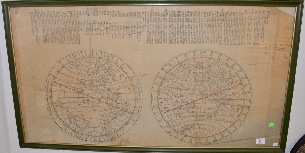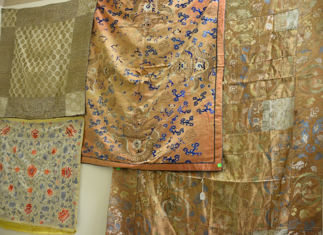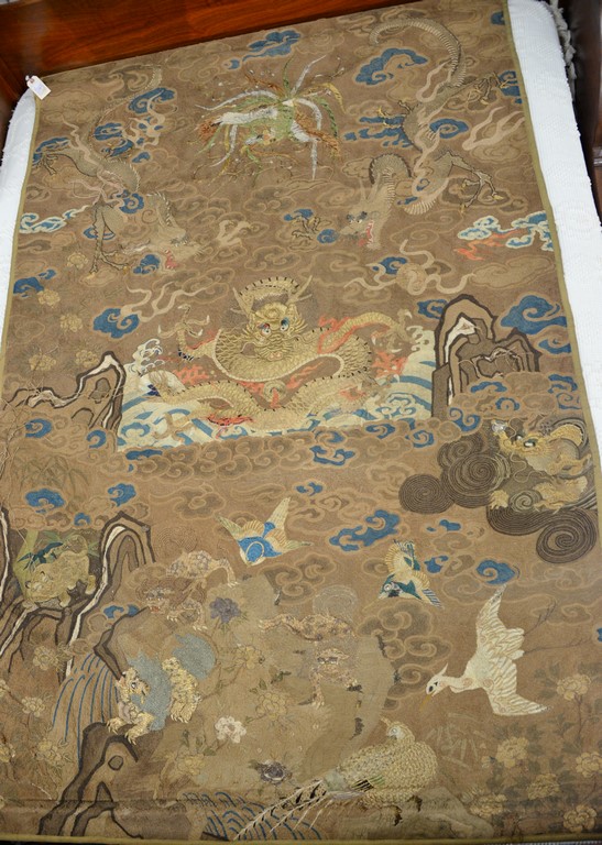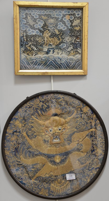 Two piece lot to include a round dragon embroidered rank badge with gold and silk thread and a Chinese military rank badge with embroidered silk depicting a leopard surrounded by bats, antiques, and clouds, standing on lotus over crashing waves and coy. round one as is with tears dia. 17 1/4in. & 10 1/2 x 11