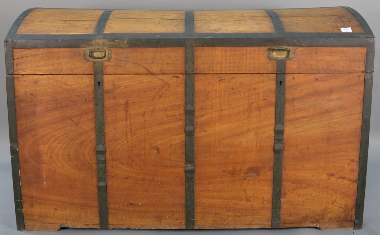 Camphorwood brass bound chest having domed top with large brass handles, interior with two camphorwood trays and one till, 19th century.