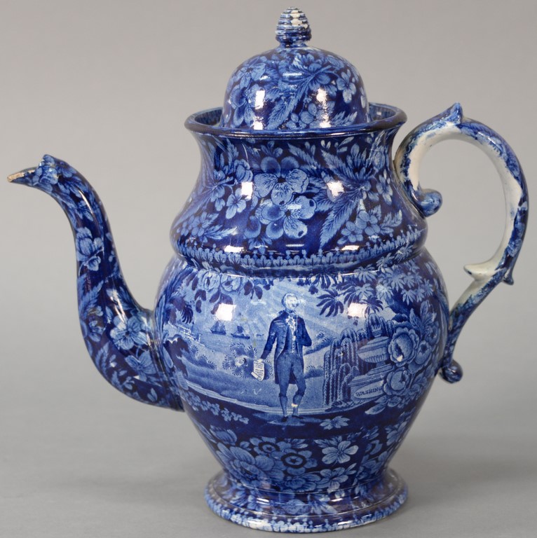 Historic Blue Staffordshire coffee pot depicting Washington tomb with ships in background. spout with edge chips, cover with hairline crack and small chip height 11 1/2 inches Provenance: Estate of R. Donald Bassette