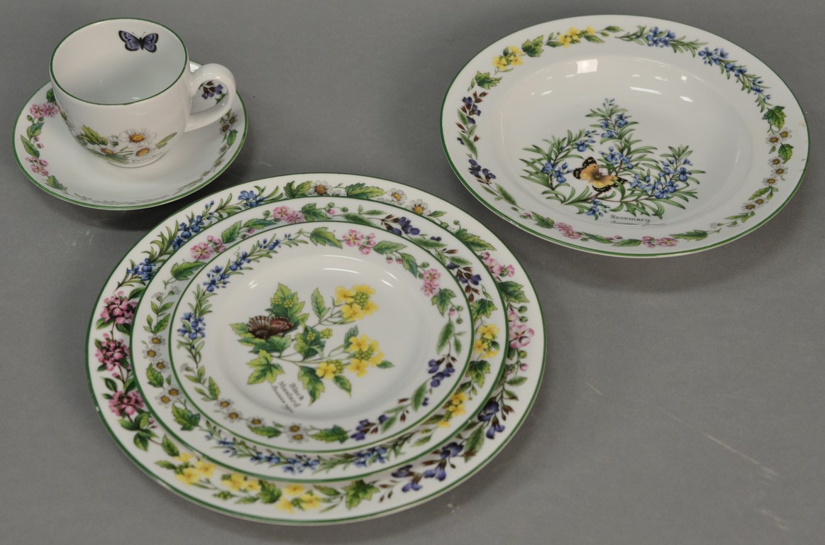 Set of Royal Worcester Herb porcelain dinnerware to include 12 dinner plates, 22 luncheon plates, 19 bread plates, 21 large rim soup bowls, 5 small soup bowls, 8 tea cups, 3 coffee cups, 14 saucers, salt and pepper shakers, gravy boat, 2 covered sugar bowls, and 3 creamers