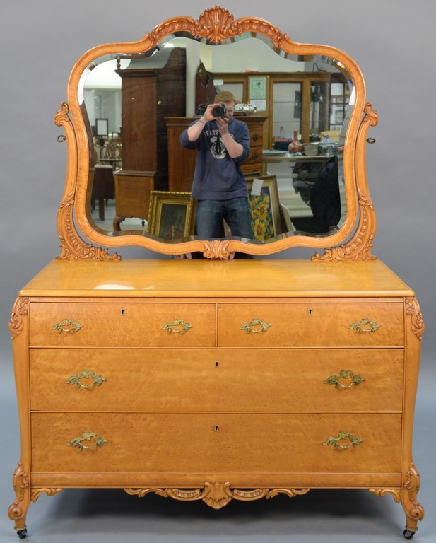 Victorian birdseye maple chest and mirror with bombay sides, excellent condition. total height 72 inches, width 53 1/2 inches Provenance: Estate of Dr. Steve Leder
