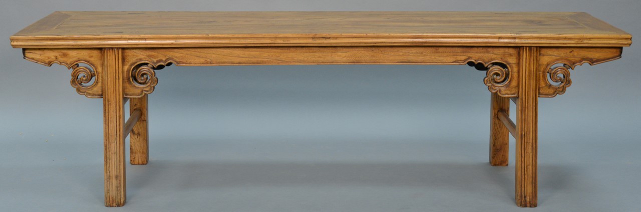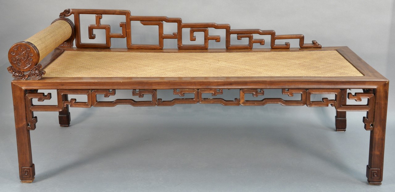 Chinese hardwood bed with woven roll arm and woven inset surface with pierced carved back and skirt set on square legs.