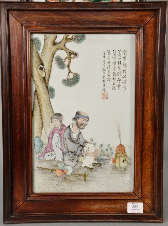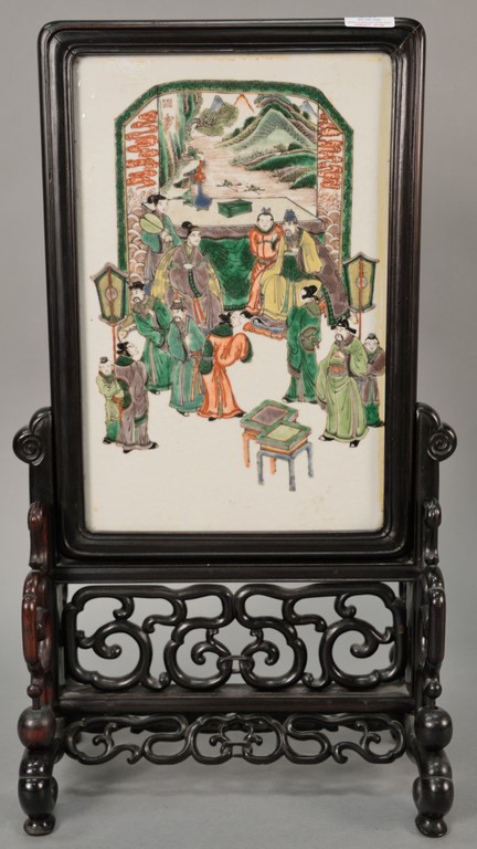 Famille verte porcelain plaque depicting Chinese scholars in hardwood frame on hardwood stand with separately carved balls. height 25 inches, width 13 inches plaque size: 15 1/2 x 10 1/4 Provenance: Previously sold by Joseph Wei