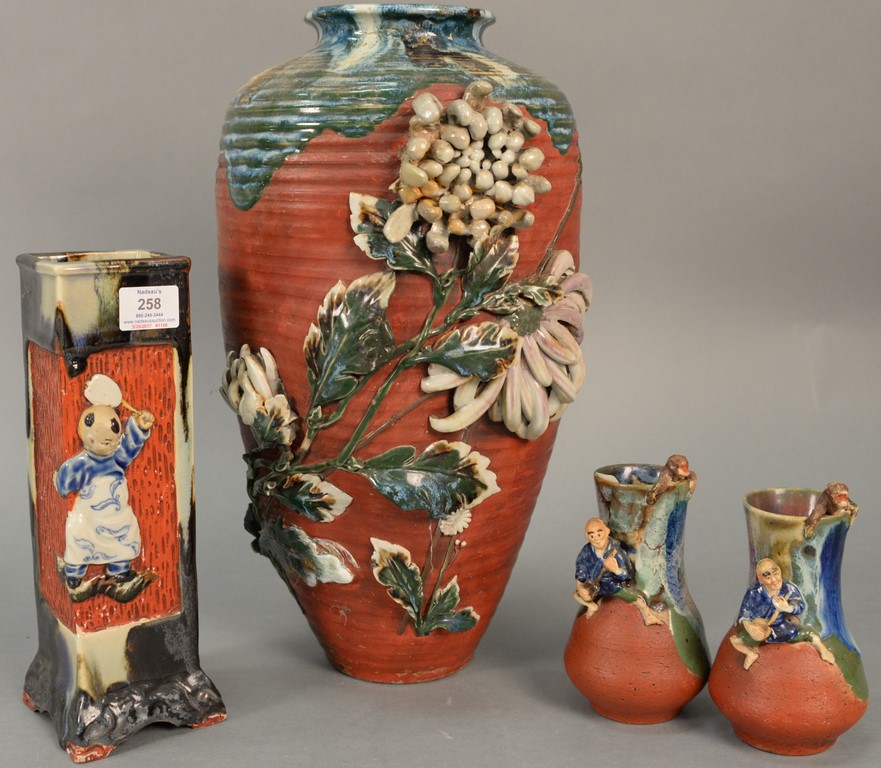 Four Japanese three dimensional vases including a large vase with molded flowers and three smaller vases with molded figures.