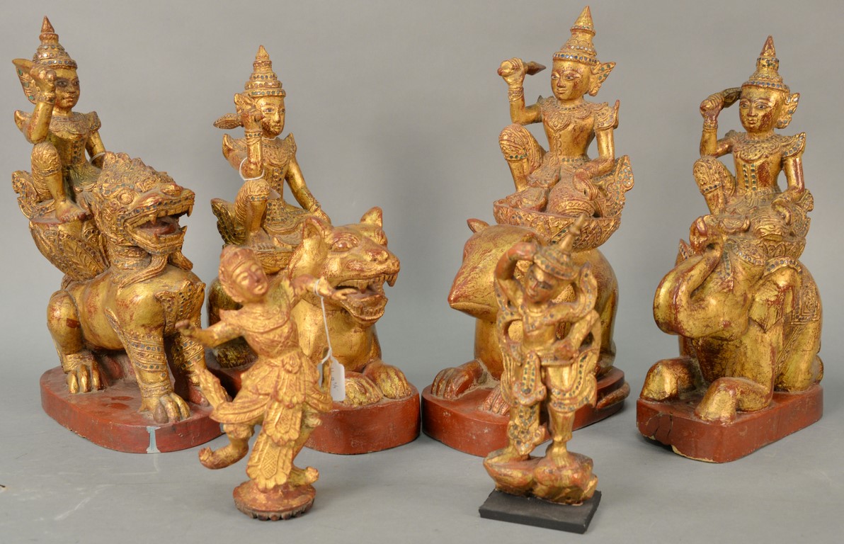 Set of six Southeast Asian polychrome and gilt decorated wood figures to include set of four figures on the back’s of animals and two small polychrome and gilt wood dancing figures.