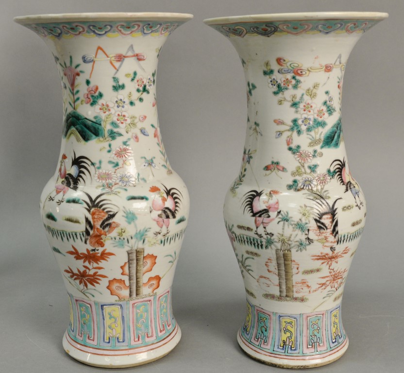 Pair of 19th/20th century Chinese famille rose phoenix tall baluster vase, decorated with roosters in a garden amongst flowering trees.