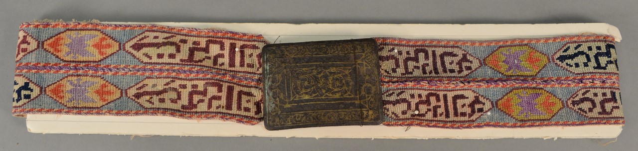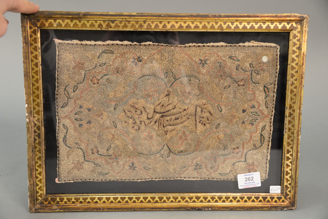 Embroidered Persian Quran box cover, gold and silver Kehma Script, possibly says Mohammed Ali Hasan Hosein- Allah is Sufficient for Us, probably 18th century or earlier.