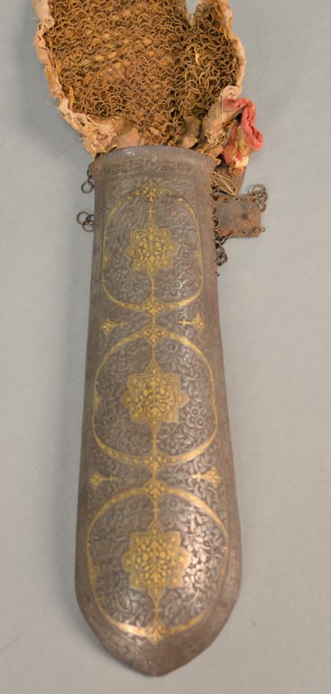 Middle Eastern Jambiya dagger with double edge blade, finely engraved with floral motifs and gold decorations with a brass and hyde scabbard.