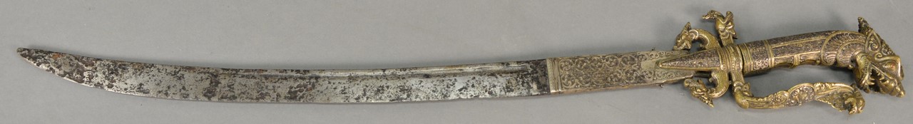 Sri Lanka Sinhalese sword Kastane with curved single edged blade having gilt hilt, the guard with openwork head of mythical beast and the grip carved with scrollwork and dragon’s head pommel. total length 25 inches
