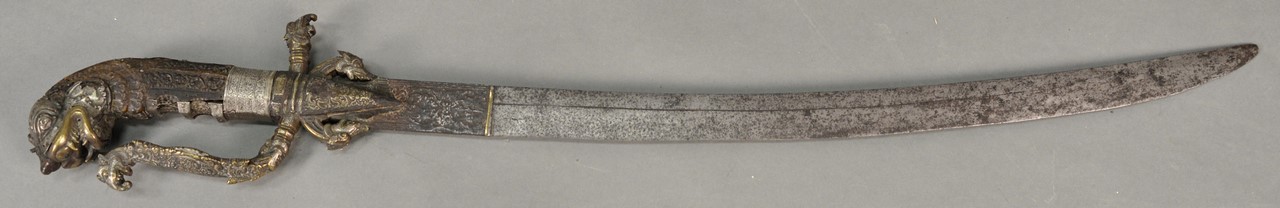 Sri Lanka Sinhalese sword Kastane with curved single edged blade, the wood and bronze hilt with applied silver and brass panels, the guard with openwork head of mythical beast and the grip carved with scrollwork and a dragon’s head pommel. some minor losses, some silver at beginning of blade missing total length 25 1/2 inches