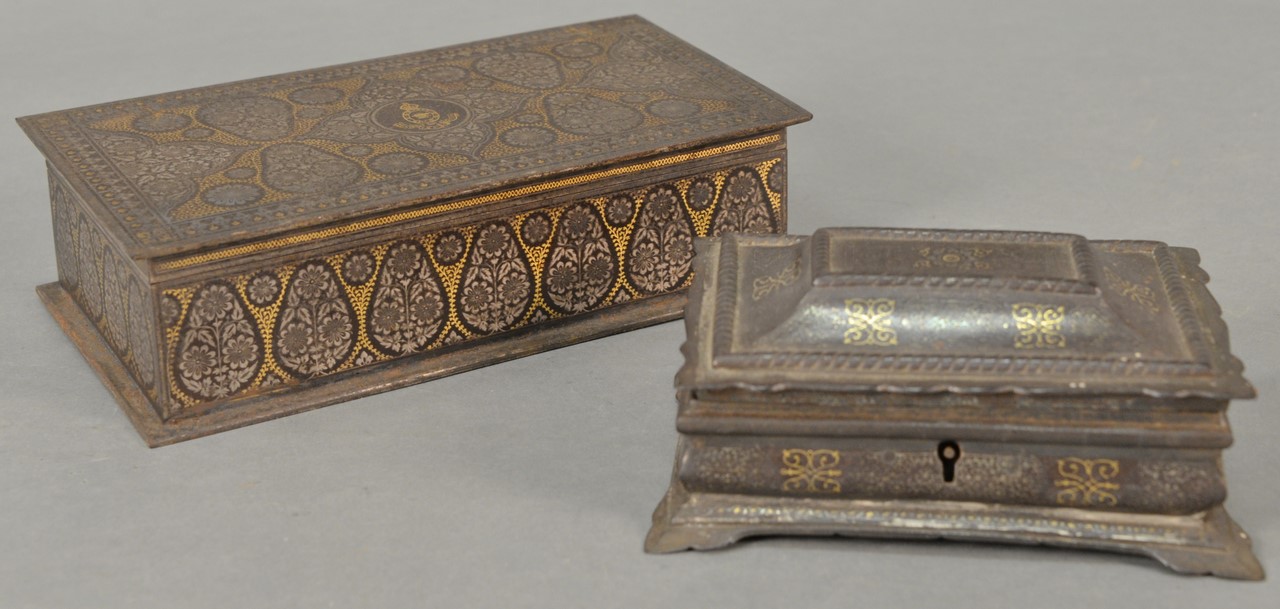 Two metal hinged covered mixed metal boxes including a box with silver and gold inlays having wood interior and crown and cannon on cover marked Mountain Battery 31st and the other jewelry box with key lock top having brass and silver inlays.