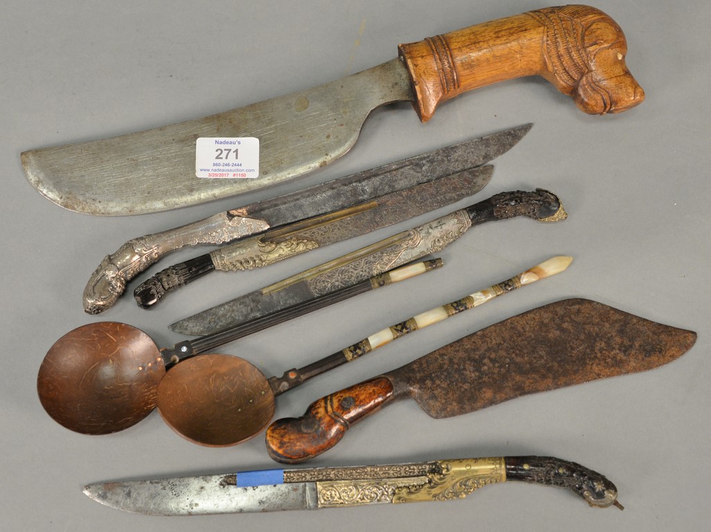 Nine piece lot with four Middle Eastern knives with horn handles and silver mounts along with knife with carved dog handles and bone handed early knife and two ottoman shebert spoons and steel pin.