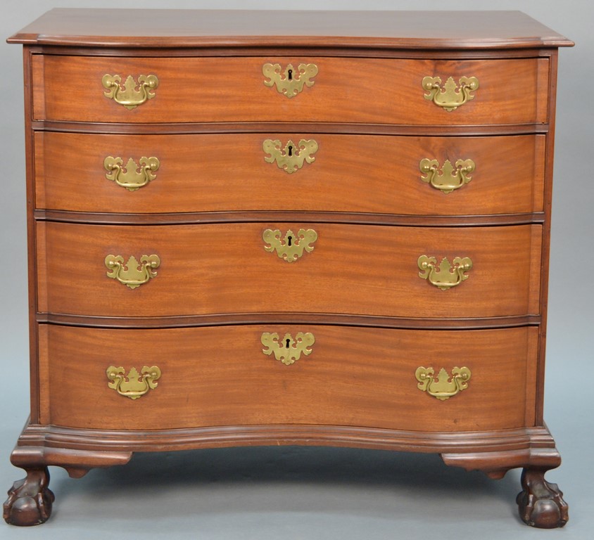 Mahogany chest having serpentine top over four conforming drawers all set on ball and claw feet, probably Eastern Connecticut circa 1760-1780.