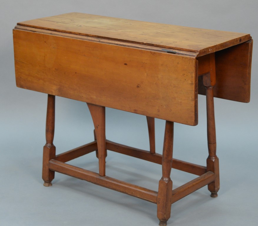 Queen Anne cherry Butterfly table having rectangular drop leaves on turned legs with stretcher base, traces of original red paint under.