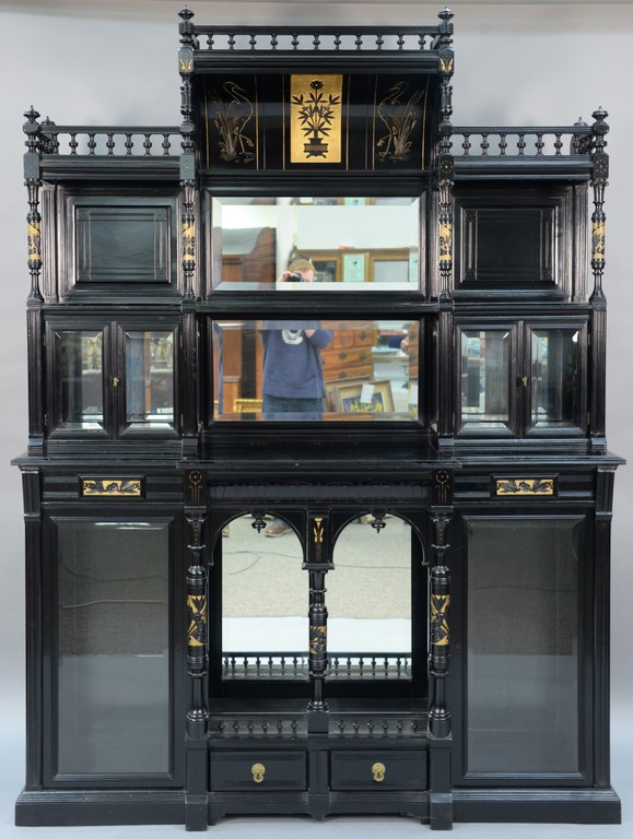 Kimbel & Cabus ebonized etagere with incised storks, gallery shelves, and drawers, all doors with beveled glass. height 94 1/2 inches, width 70 1/2 inches, depth 15 inches Provenance: Estate of Dr. Steve Leder