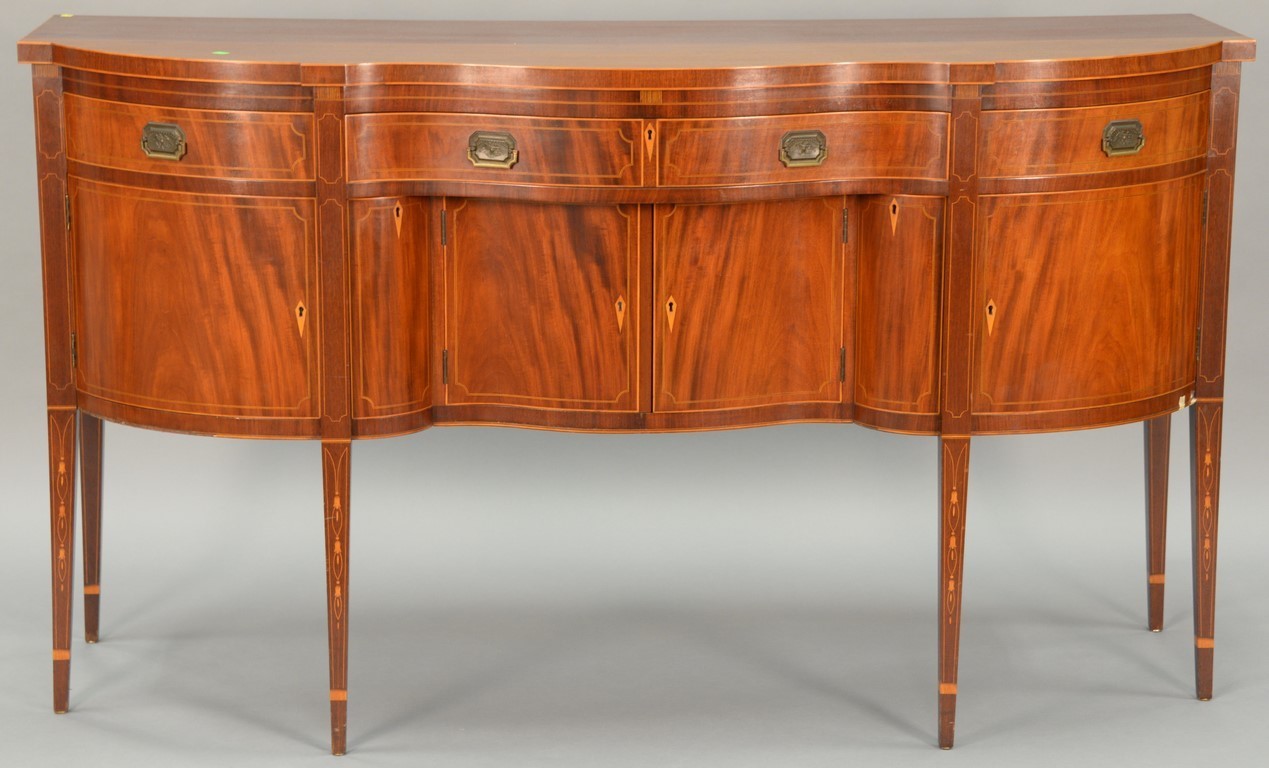 Margolis mahogany sideboard having shaped serpentine top over conforming case with three drawers over four doors plus two bottle drawers all set on square tapered legs with bell flower and line inlays, signed Margolis 1931 on back and labeled in drawer.