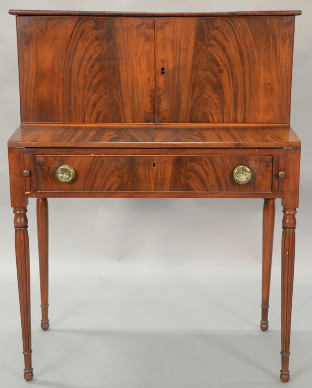 Sheraton mahogany desk with doors over flip lid writing surface over one drawer set on turned and fluted legs, circa 1830.