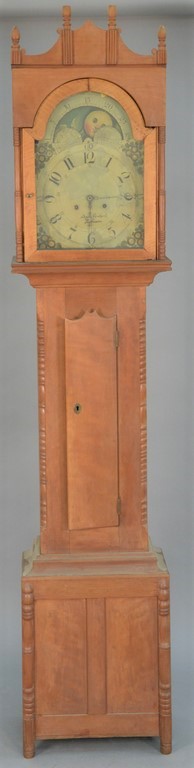 Cherry tall case clock having arched top over tombstone tiger maple door, all flanked by turned columns set on turned legs with brass works and painted moon phase dial marked Jacob Guthard Lebanon, early 19th century. height 94 inches