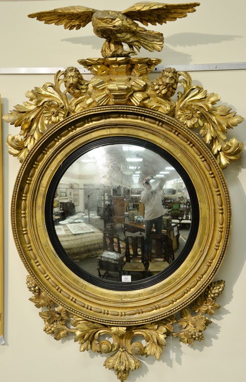 Caved and gilt convex mirror mounted with eagle flanked by two lions and foliate carving on circular deep cove with ebonized slip over fruit and foliate carving, 19th century. total height 60 inches glass only diameter 23 1/2 inches