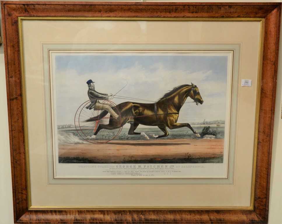 Currier & Ives large folio hand colored lithograph Trotting Stallion George M. Patchen Jr. of California Entered according to act of Congress 1866 marked lower left: Lith & Pub’d by Currier & Ives Donald A. Heald label on verso sight size 19 1/4 x 26 1/2 Provenance: Property from Credit Suisse’s Americana Collection