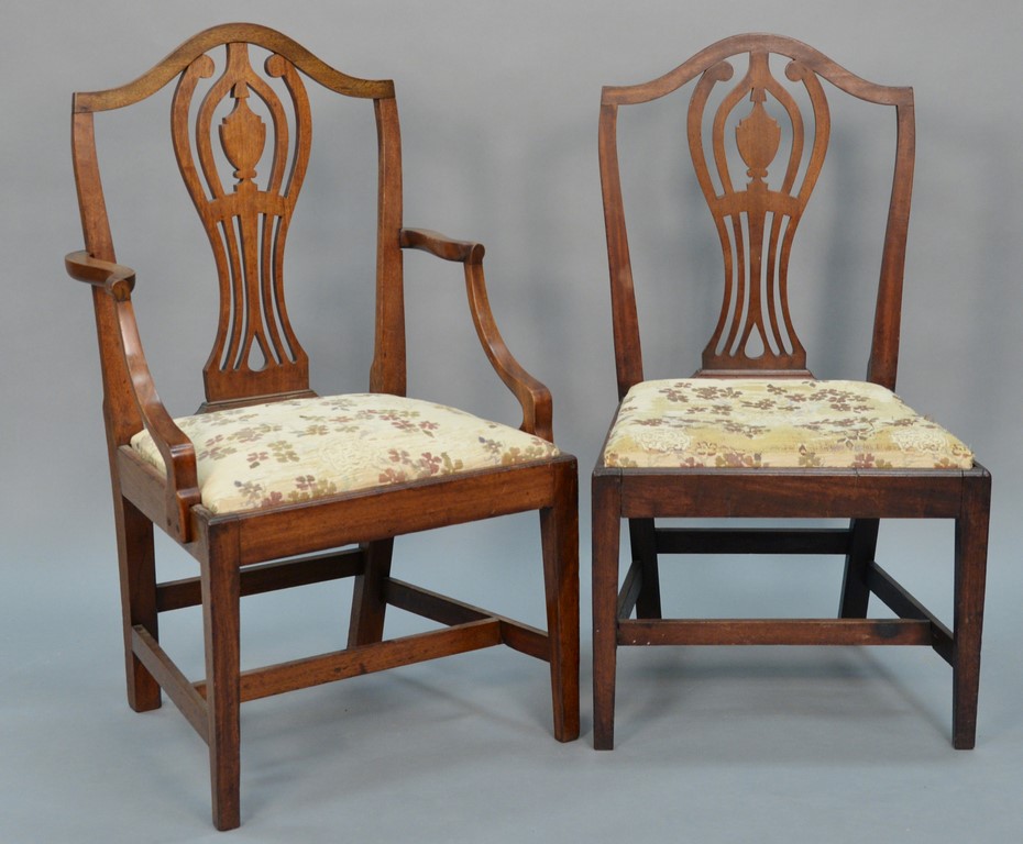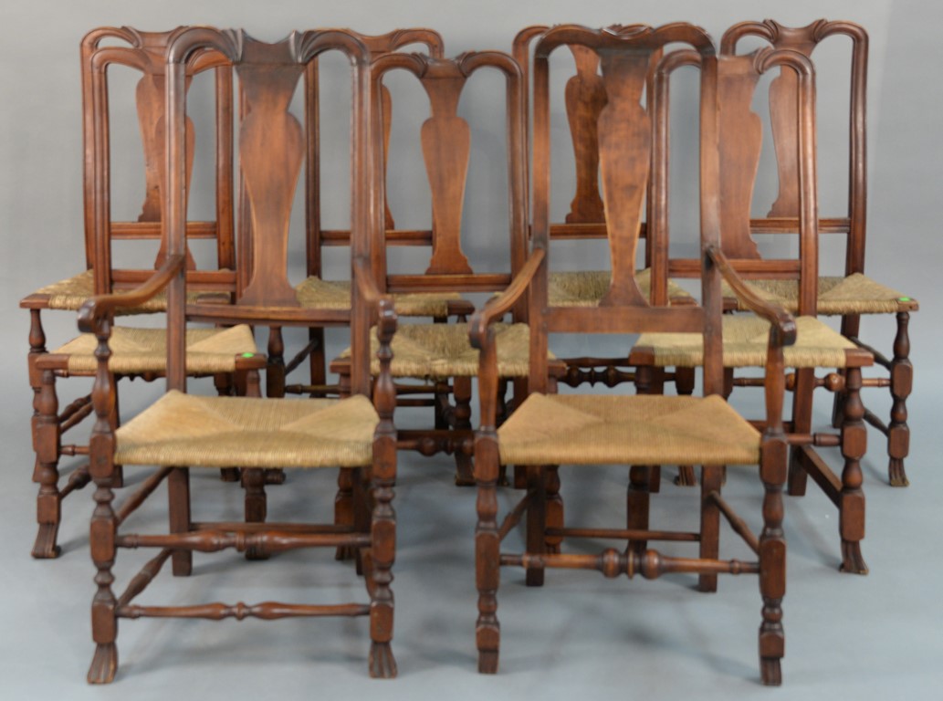 Assembled set of nine Queen Anne chairs with rush seats including seven side chairs and two armchairs, all with turned stretchers and Spanish feet, circa 1750.