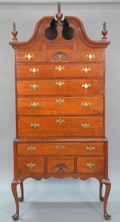 Queen Anne highboy in two parts, upper portion with full bonnet top over fan carved center drawer flanked by two short drawers over four long drawers on lower portion with one long drawer over center fan carved drawer flanked by two short drawers with scalloped apron all set on cabriole legs and ending in pad feet, Connecticut circa 1760. total height 83 1/2 inches, width 35 1/4 inches