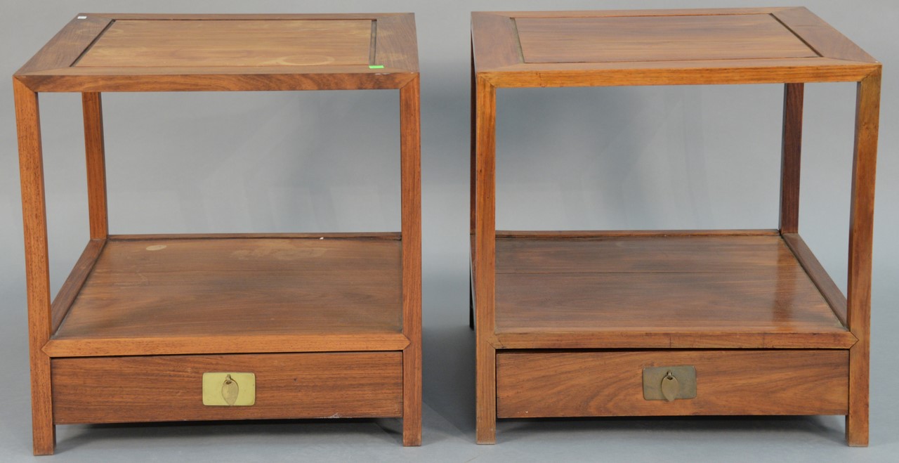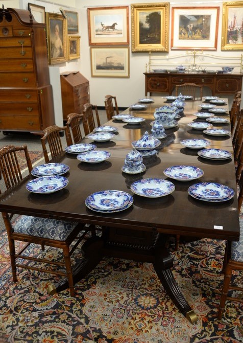 Three part mahogany dining table, each section separates as a square or round with four drop leaves, each table set on square pedestals on base with four downswept members ending in brass capped feet, 20th century. total length 156 inches, width 52 inches each table square 52 inches each table round 73 1/2 inches