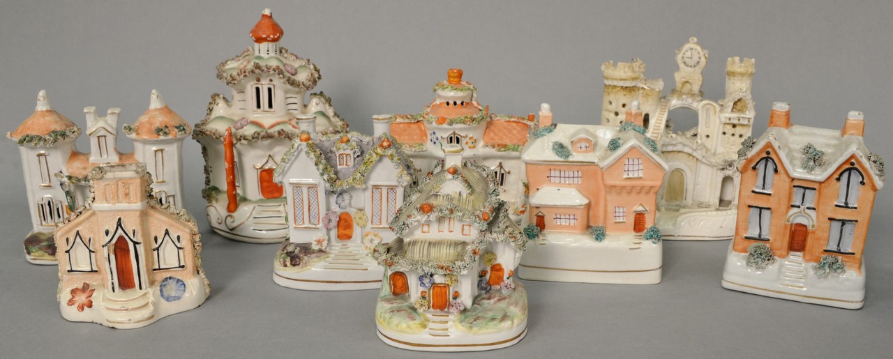 Staffordshire nine piece lot of cottages and castles including two banks.