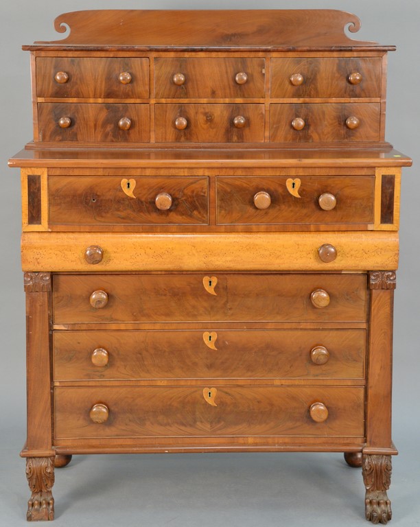 Empire mahogany and birdseye maple chest having stacked double drawer top over two short drawers with heart inlays over birdseye maple drawer over three drawers set on carved paw feet, circa 1840.