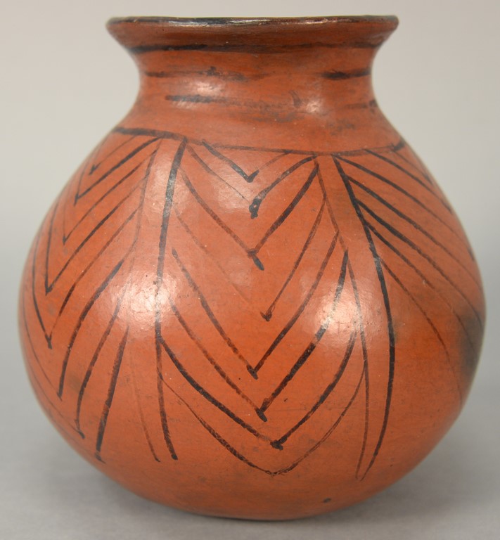 Two painted red pottery jars, Majiayao culture, Machang type, painted in red and black with anthropomorphic figural designs and abstract patterns, formally appraised as 3rd century B.C. heights 11 1/2 inches and 16 inches
