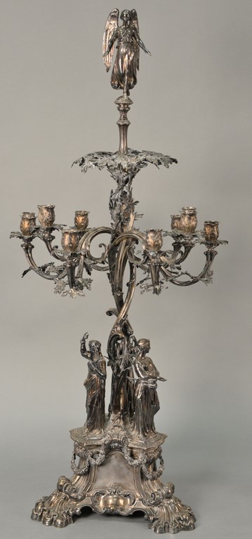 Edward and John Barnard English silver candelabra having angelic figure at top over leafy design over scroll design with three arms, each with three candle holders and leaf design all on base with three figures on chasing and hinged wreaths set on three scrolled feet, probably 1853-1854. total height 42 inches, figures height 8 1/2 inches, base across 14 inches 362 troy ounces