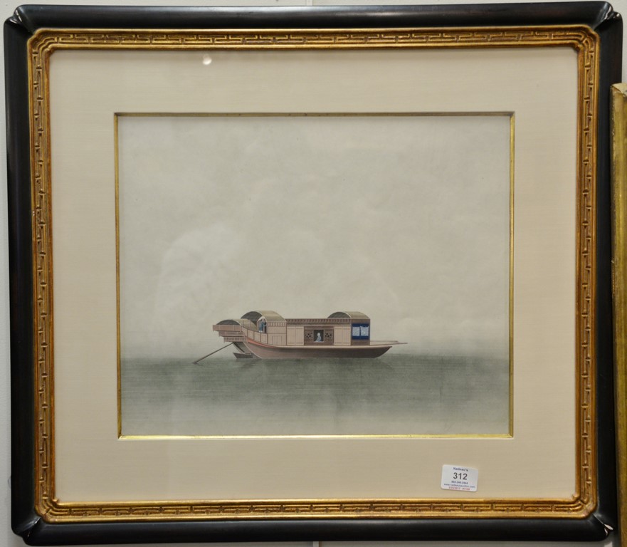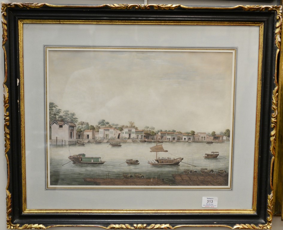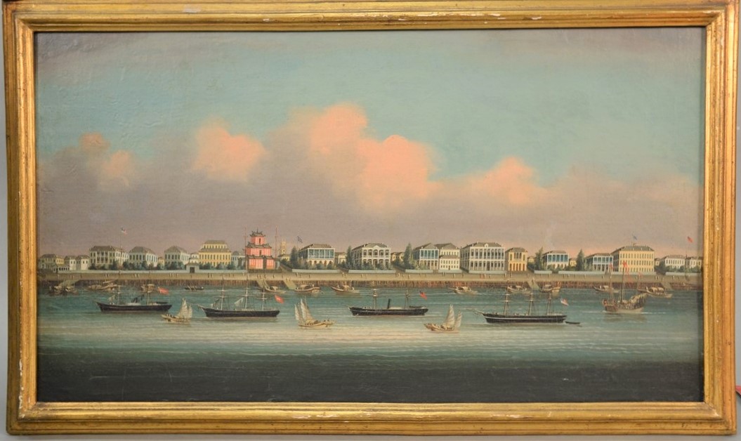 depicting a detailed view of the Western Companies British and American Consulate, The Customs House, Holy Trinity Church in background with their war battle ships amongst Chinese junks on the Huangpu River, Chinese trade export.